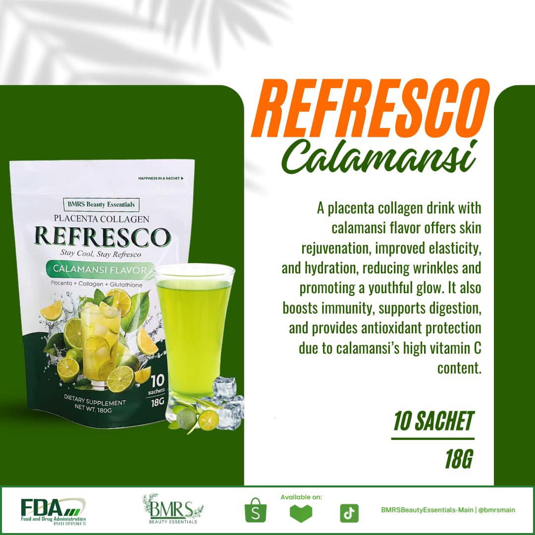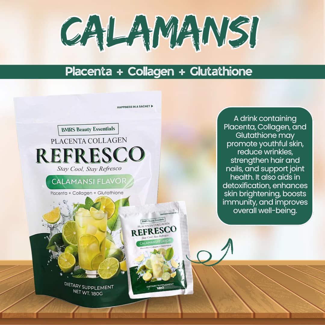 BMRS Calamansi Refresco is a drink that contains collagen and glutathione, and is said to nourish the body and promote glowing skin.