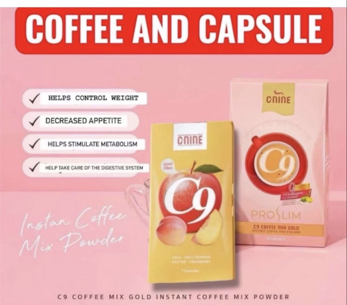 C-Nine (C9) ProSlim Coffee is a popular Thai instant coffee mix designed for weight management and skincare, often featuring ingredients like fish collagen, L-carnitine, and white kidney bean extract. Marketed as a sugar-free,, low-fat "wellness" drink, it aims to boost metabolism and improve skin elasticity.