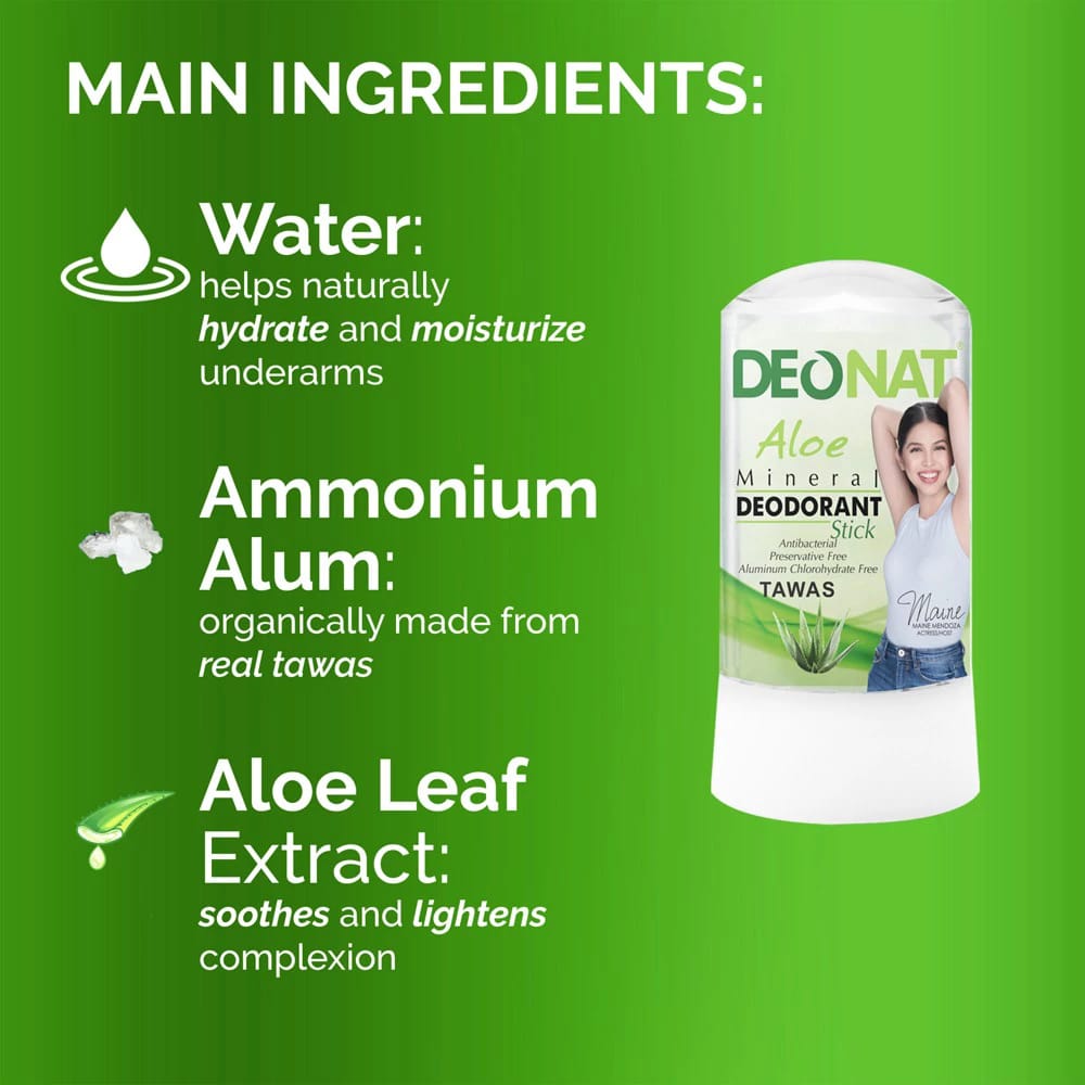 Raise your arms with confidence with Deonat Aloe Mineral Deodorant Stick. It reduces perspiration and prevents bacteria that cause body odor. Provides protection all day long and helps moisturize the skin. Non-irritating and non-staining.