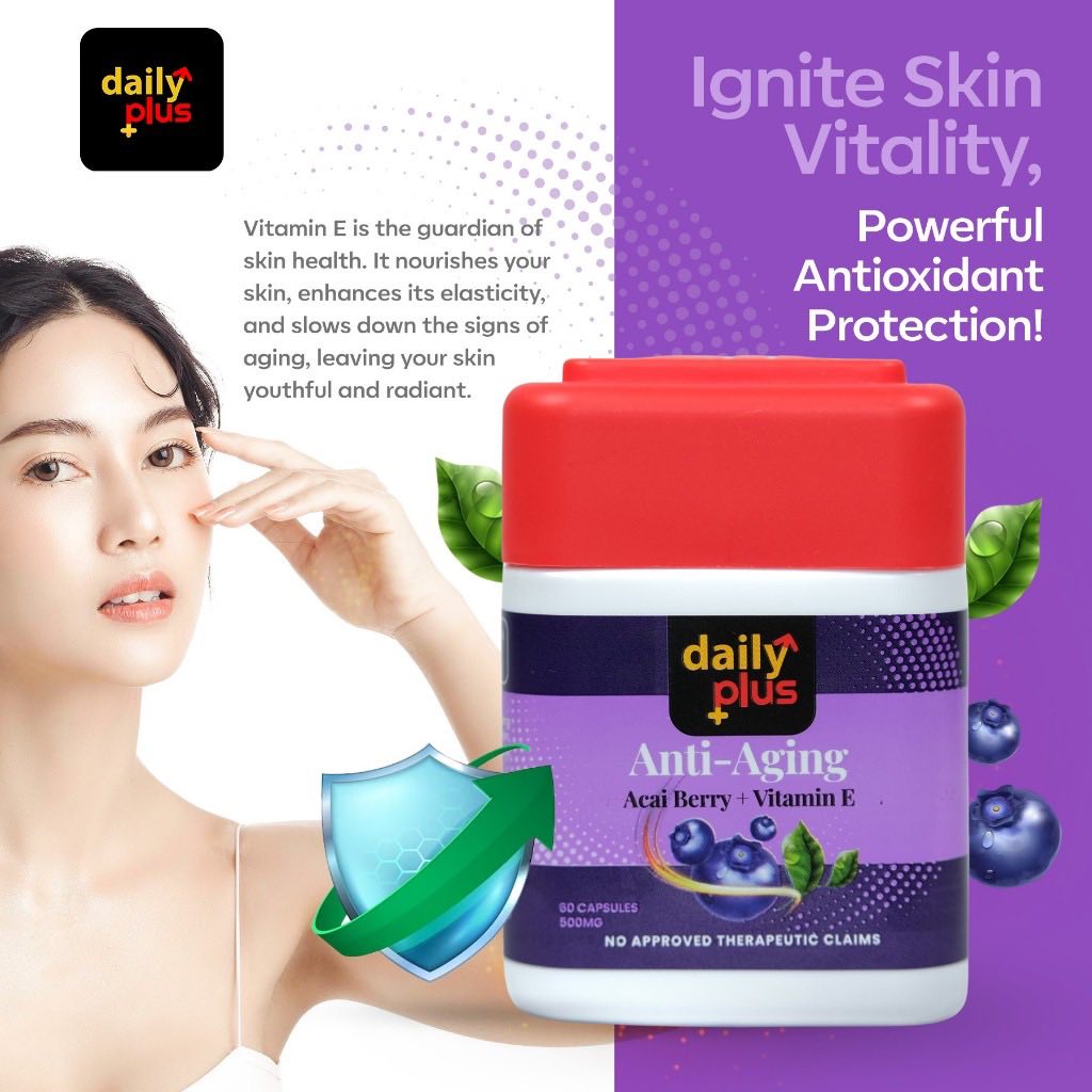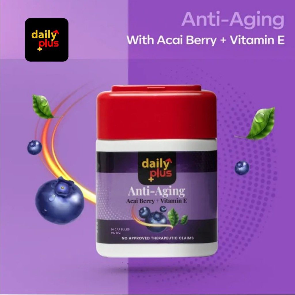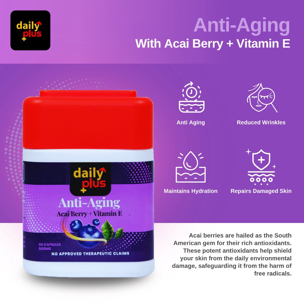 Daily Plus Anti-Aging Acai Berry & Vitamin E (60 capsules) isa dietary supplement designed to promote youthful, healthy skin by fighting free radicals and improving skin vitality. Formulated with antioxidant-rich acai berry, this product aims to rejuvenate skin and reduce signs of aging for all genders.