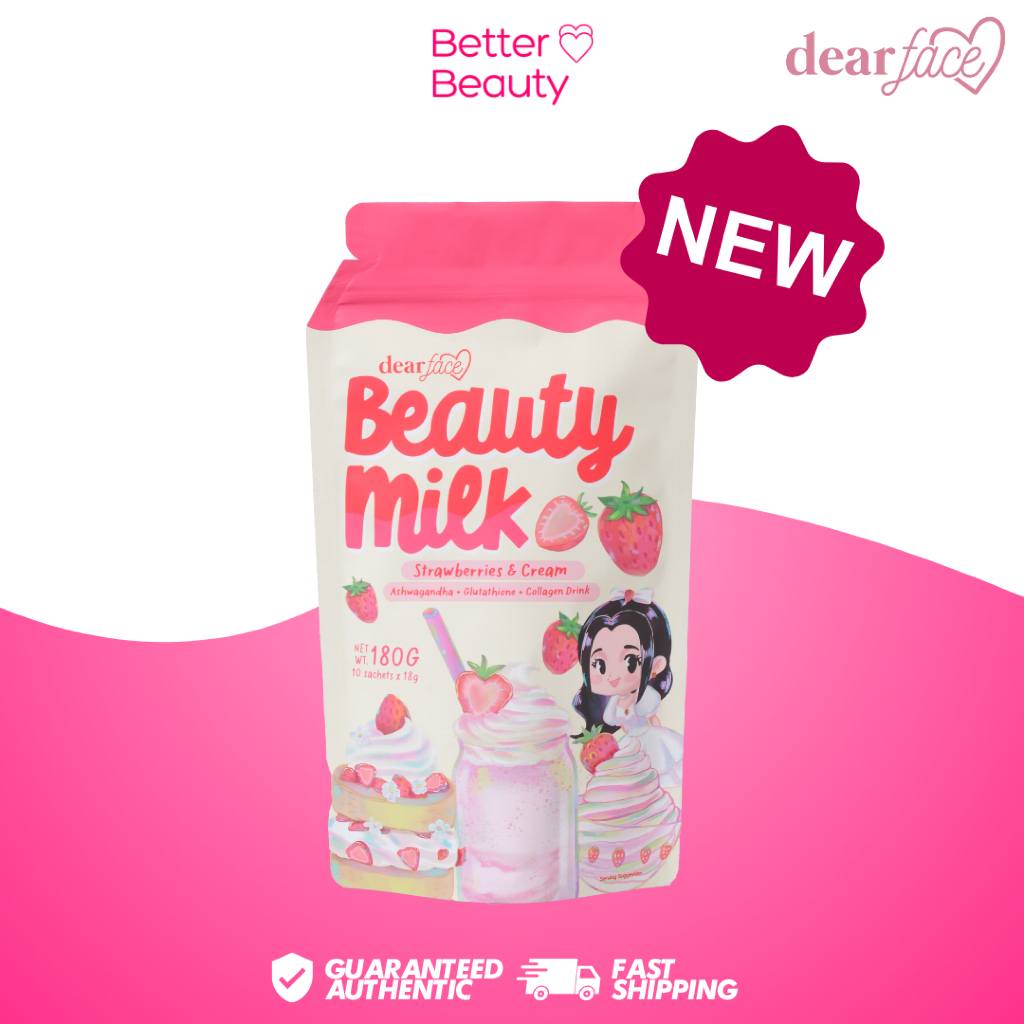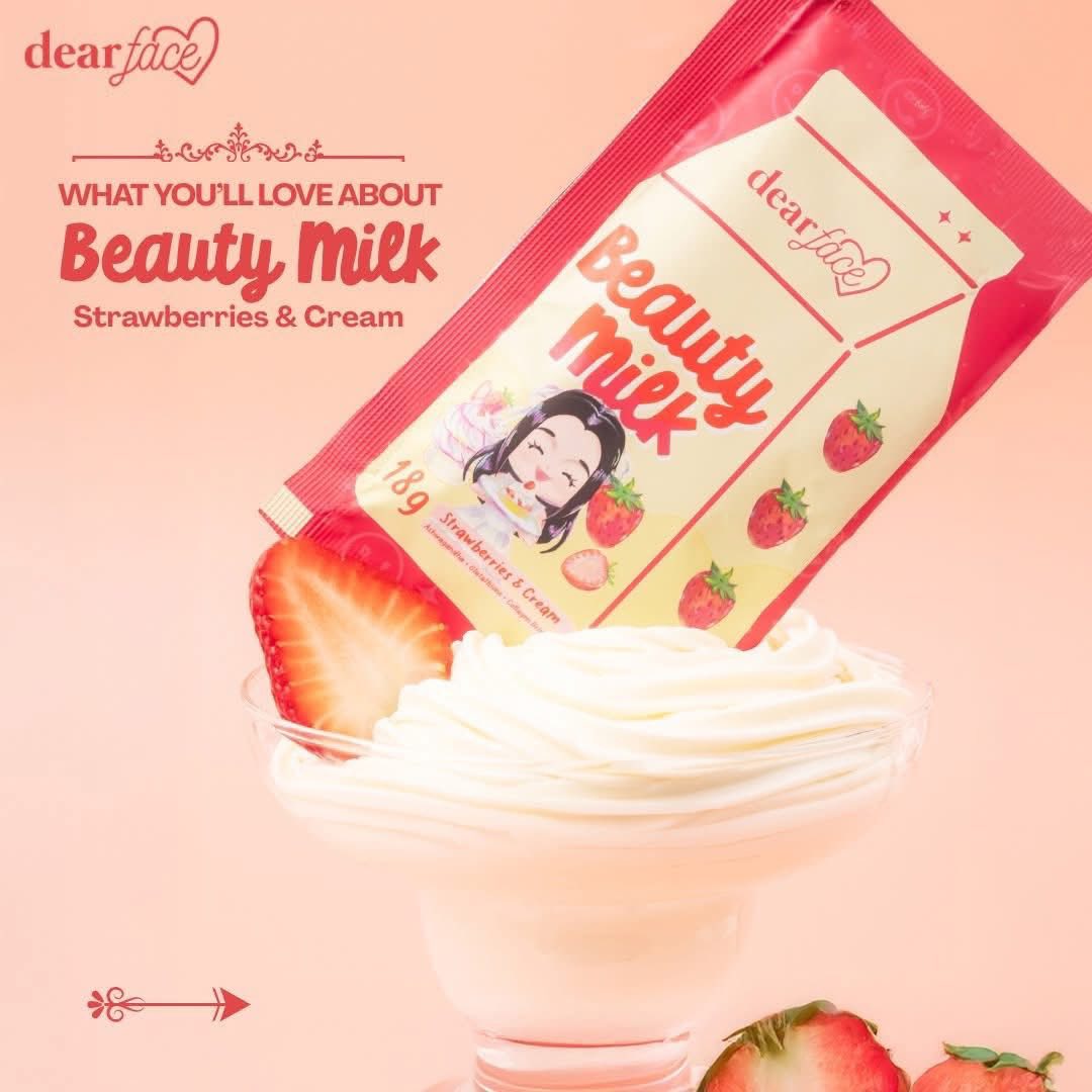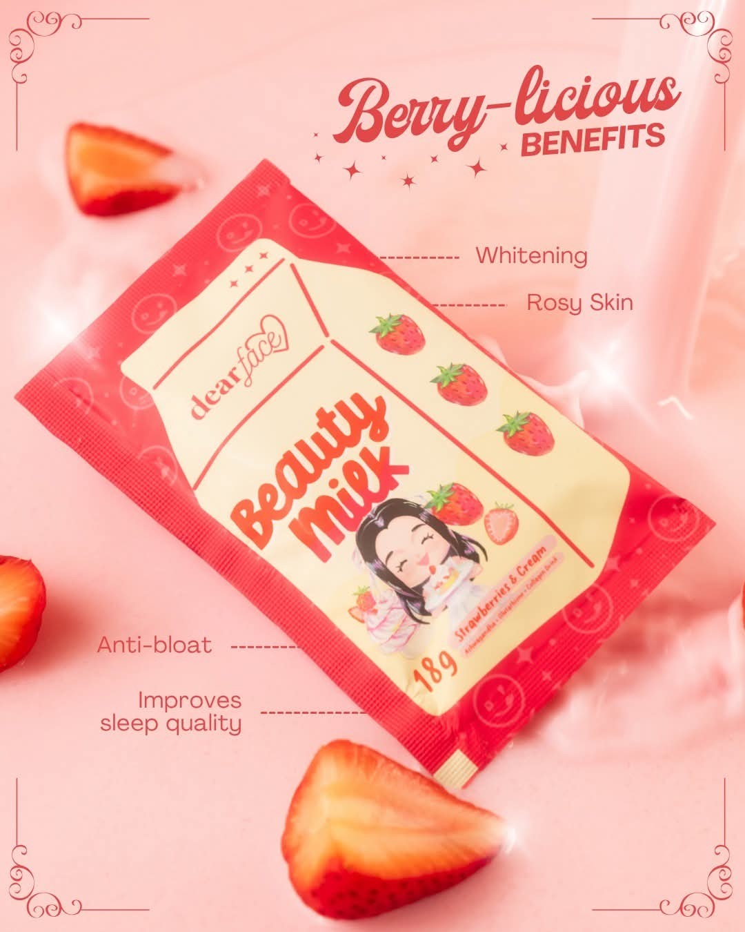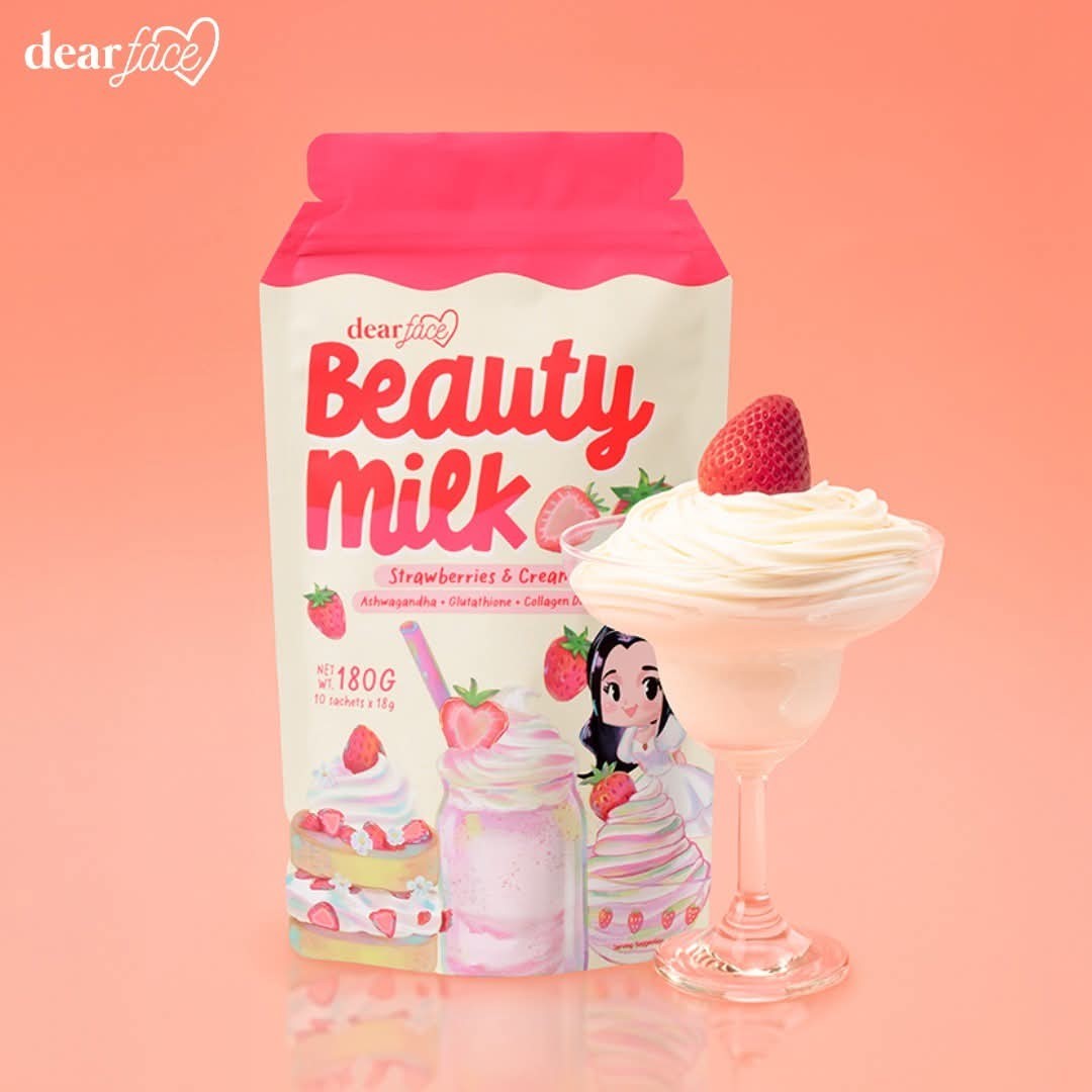 Dear Face Beauty Milk Strawberry & Cream is a drink that aims to brighten and lighten the skin while also providing calming and mood-boosting effects. It is formulated with ingredients like glutathione, collagen, and ashwagandha, and is designed to be a nightly ritual to promote a 24/7 glow.