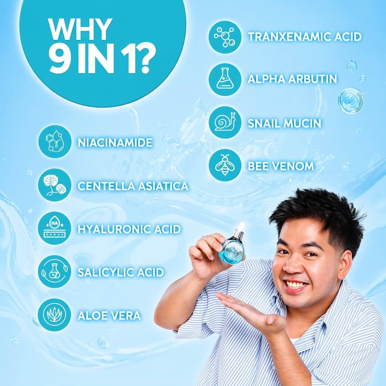 The serum is marketed as a "9-in-1" solution due to its blend of active ingredients targeting various skin concerns: