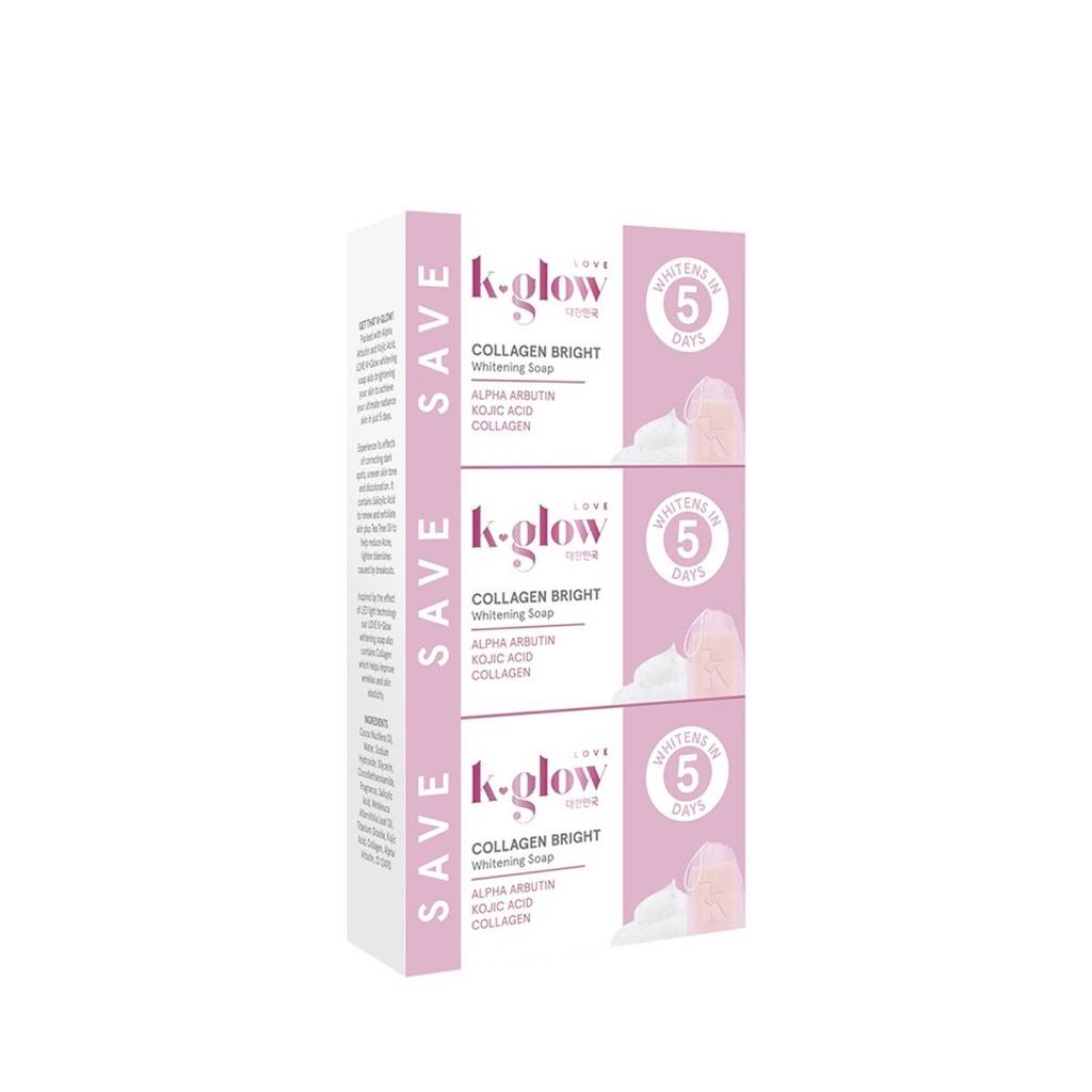 The K GLOW Collagen Bright Whitening Soap (3x60g) is a face and body soap formulated with a blend of key ingredients like Alpha Arbutin, Kojic Acid, Salicylic Acid, Tea Tree Oil, and Collagen to target dark spots, uneven skin tone, and acne.