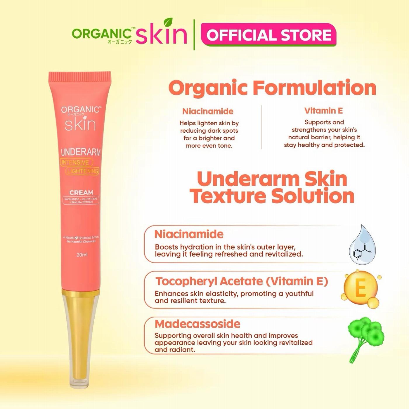 Organic underarm creamsfocus on natural ingredients like rose water, aloe vera, witch hazel, niacinamide, and plant extracts to lighten dark spots, smooth rough skin, reduce irritation, and moisturize, often free from harsh chemicals like sulfates and alcohol, offering a gentle yet effective way to brighten and care for sensitive underarm skin for a brighter, smoother, and fresher feel.