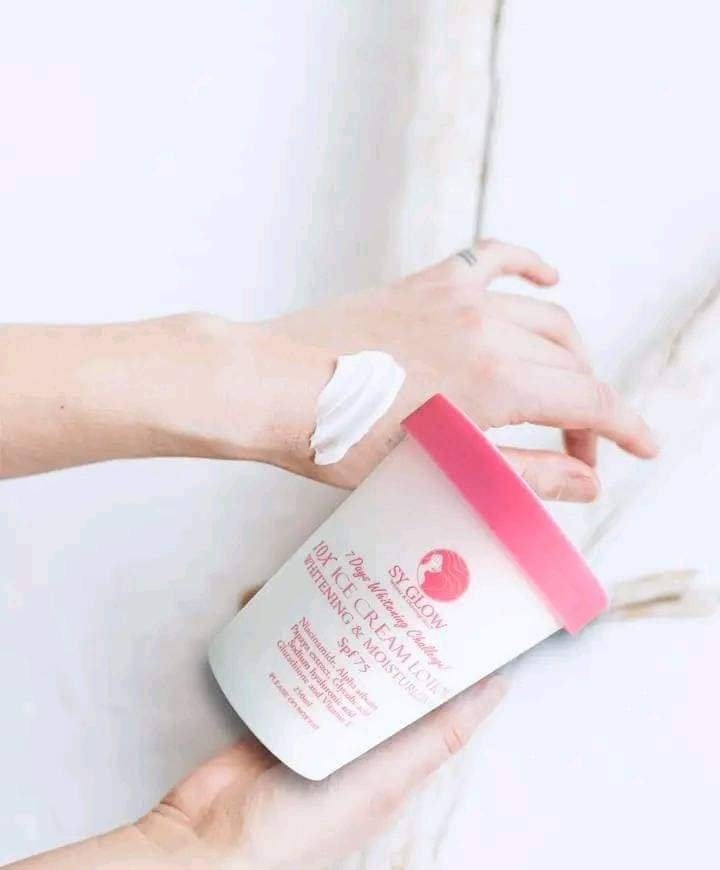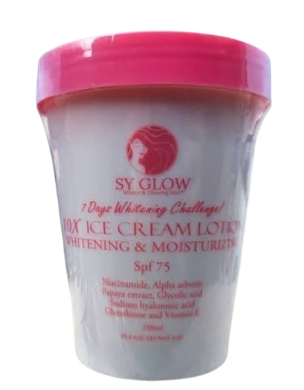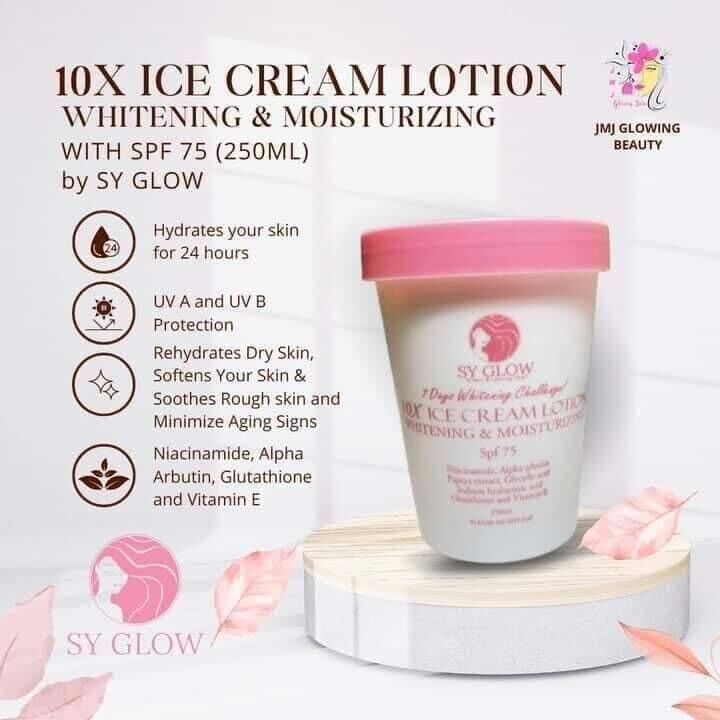 Introducing SY GLOW Ice Cream Lotion, your ultimate solution for body whitening and moisturizing. Packed with powerful ingredients like Niacinamide, alpha arbutin, papaya extract, glycolic acid, sodium hyaluronic acid, glutathione, and vitamin E, this lotion offers a 10X whitening and moisturizing effect, all while providing SPF 75 protection.