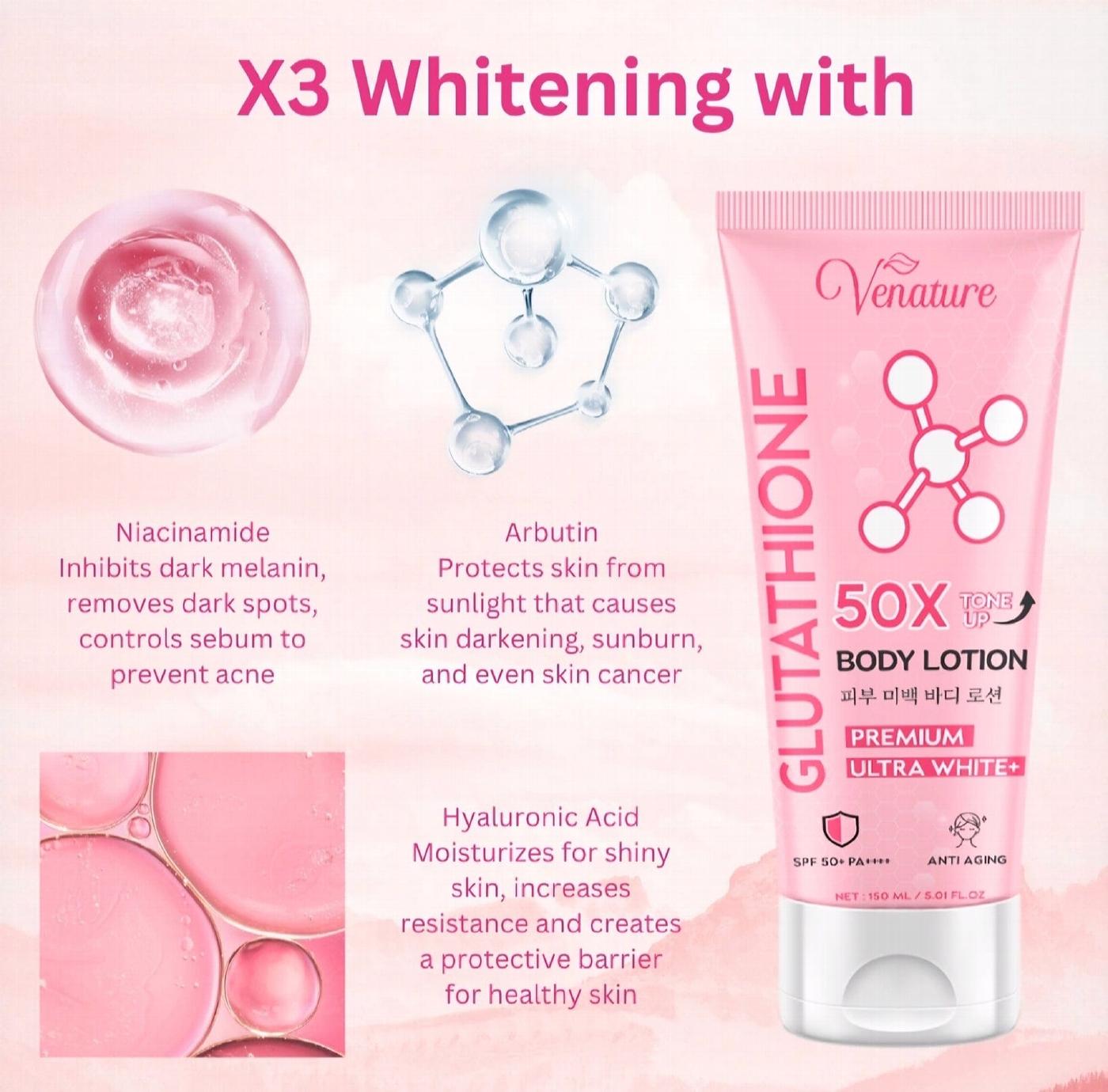 Transform your skin with our Body Tone Up 50X Ultra White Sun Defense lotion!